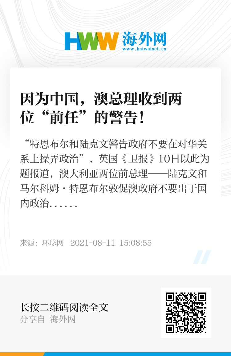 “特恩布尔和陆克文警告政府不要在对华关系上操弄政治”,英国《卫报》10日以此为题报道,澳大利亚两位前总理——陆克文和马尔科姆·特恩布尔敦促澳政府不要出于国内政治目的强化针对中国的言论。在他们看来,这可能会损害社会凝聚力。