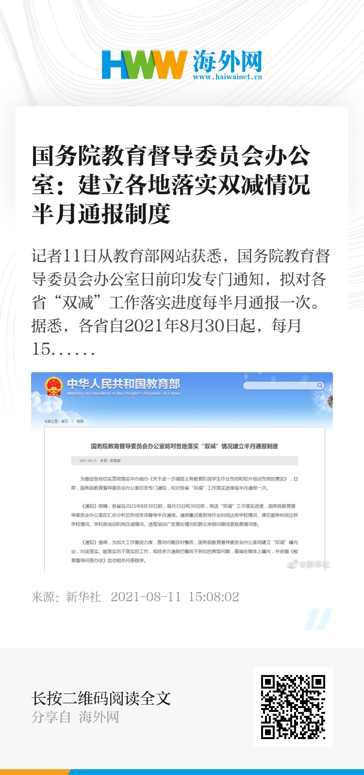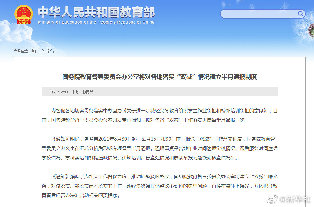 记者11日从教育部网站获悉,国务院教育督导委员会办公室日前印发专门通知,拟对各省“双减”工作落实进度每半月通报一次。据悉,各省自2021年8月30日起,每月15日和30日前,报送“双减”工作落实进度,国务院教育督导委员会办公室在汇总分析后形成专项督导半月通报。通报重点是各地作业时间达标学校情况、课后服务时间达标学校情况、学科类培训机构压减情况、违规培训广告查处情况和群众举报问题线索核查情况等。(记者王鹏)