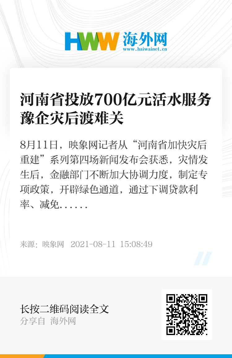 8月11日,映象网记者从“河南省加快灾后重建”系列第四场新闻发布会获悉,灾情发生后,金融部门不断加大协调力度,制定专项政策,开辟绿色通道,通过下调贷款利率、减免服务收费、延长还款周期、加大信用贷款投放等方式,千方百计帮助企业渡过难关,截至目前,全省已投放防汛救灾、灾后重建和工商业恢复生产信贷资金超过700亿元。