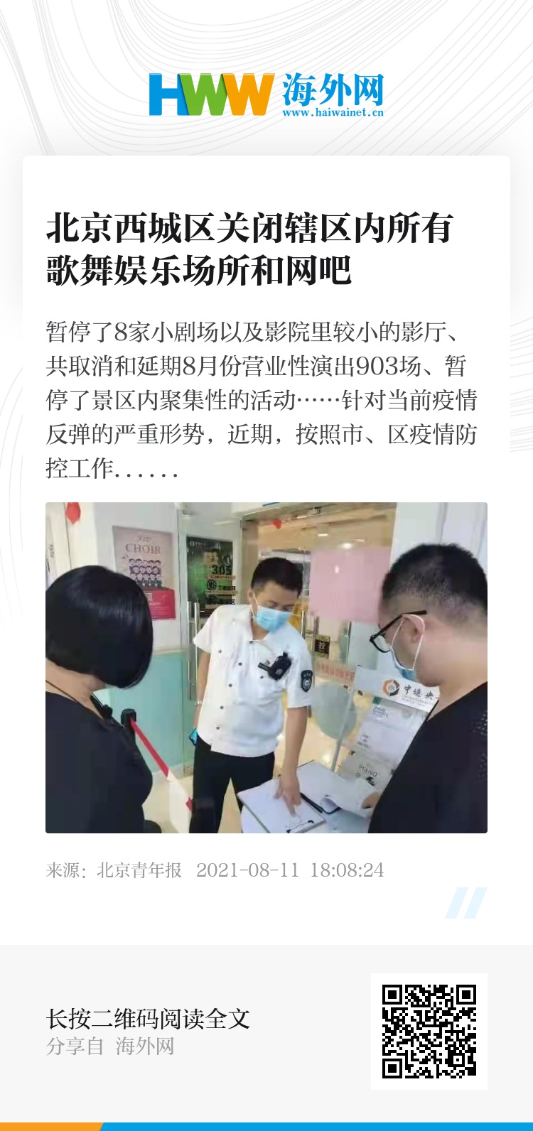截至目前,西城区关闭了辖区内所有歌舞娱乐场所和网吧,暂停了8家小剧场以及影院里较小的影厅,积极协调各演出单位举办的营业性演出活动能停尽停,共取消和延期8月份营业性演出903场。与此同时,暂停了景区内聚集性的活动。