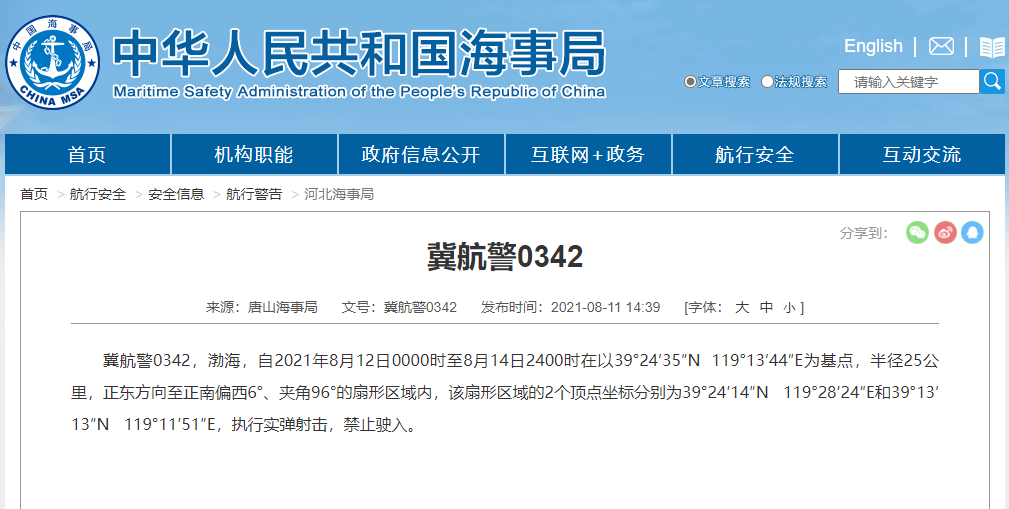 据中国海事局网站消息,唐山海事局今日发布航行警告。冀航警0342,渤海,自2021年8月12日0000时至8月14日2400时在以39°24′35″N 119°13′44″E为基点,半径25公里,正东方向至正南偏西6°、夹角96°的扇形区域内,该扇形区域的2个顶点坐标分别为39°24′14″N 119°28′24″E和39°13′13″N 119°11′51″E,执行实弹射击,禁止驶入。