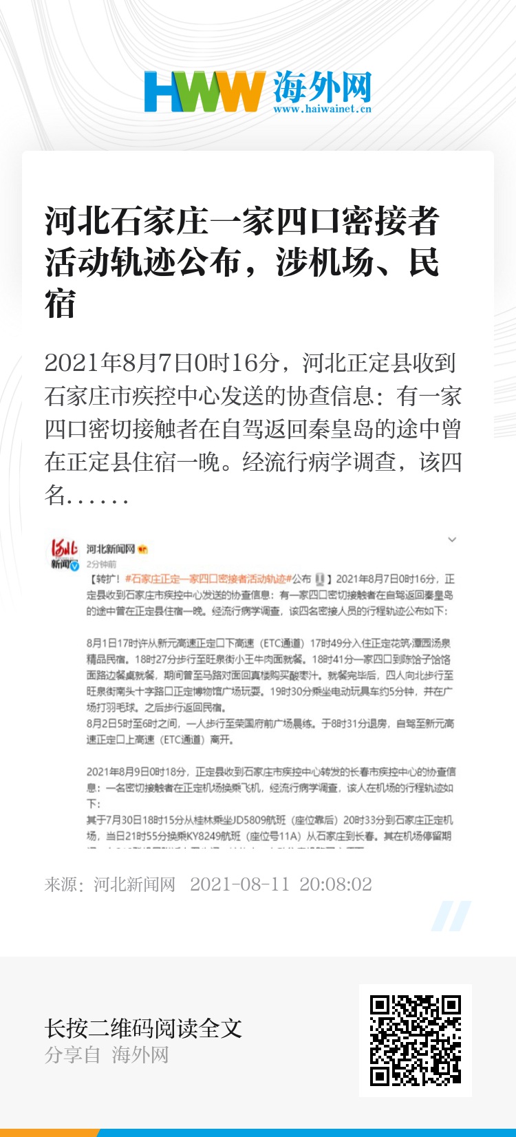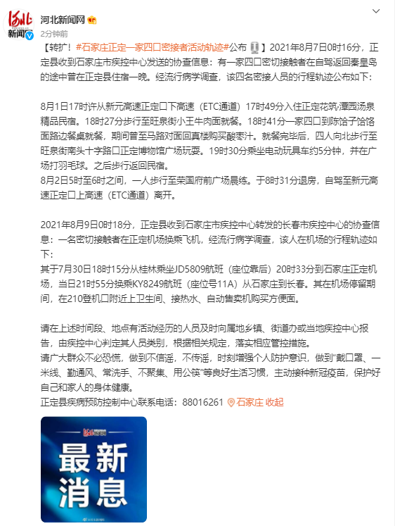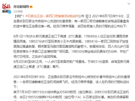 2021年8月7日0时16分,河北正定县收到石家庄市疾控中心发送的协查信息:有一家四口密切接触者在自驾返回秦皇岛的途中曾在正定县住宿一晚。经流行病学调查,该四名密接人员的行程轨迹公布如下:
