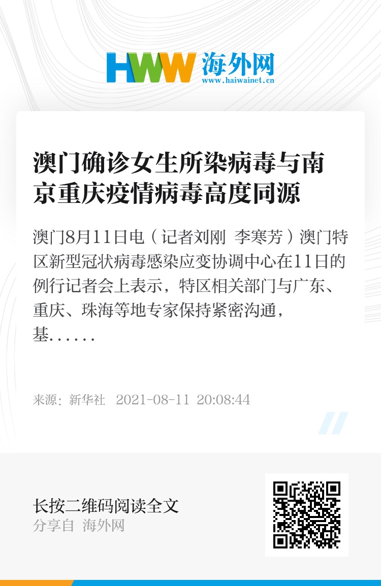 新华社澳门8月11日电(记者刘刚 李寒芳)澳门特区新型冠状病毒感染应变协调中心在11日的例行记者会上表示,特区相关部门与广东、重庆、珠海等地专家保持紧密沟通,基因测序结果显示,澳门确诊女生所染病毒与南京、重庆疫情病毒高度同源。