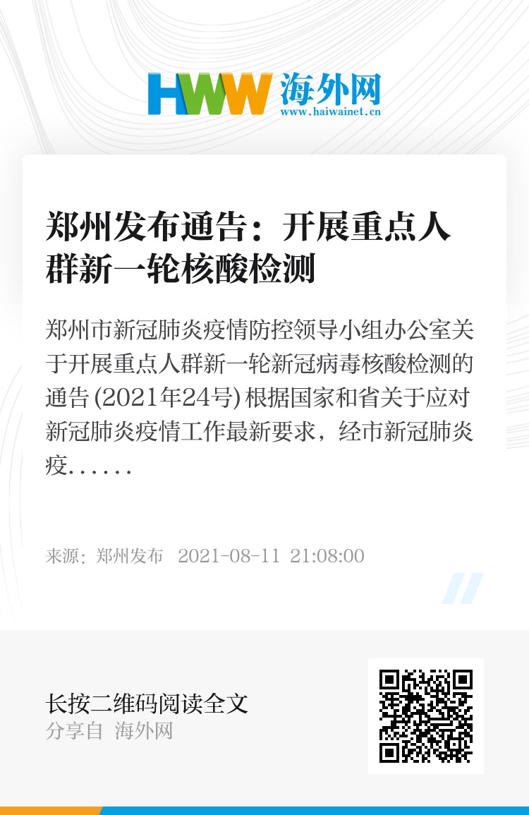 根据国家和省关于应对新冠肺炎疫情工作最新要求,经市新冠肺炎疫情防控领导小组研究,决定在郑州市域内开展重点人群新一轮核酸检测,现将有关事宜通告如下: