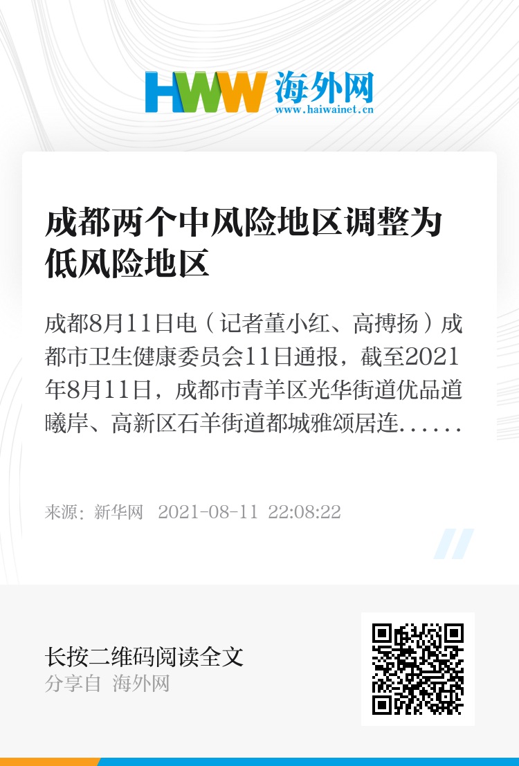 新华社成都8月11日电(记者董小红、高搏扬)成都市卫生健康委员会11日通报,截至2021年8月11日,成都市青羊区光华街道优品道曦岸、高新区石羊街道都城雅颂居连续14天无新增本地确诊病例,自8月11日15时起由中风险地区调整为低风险地区。