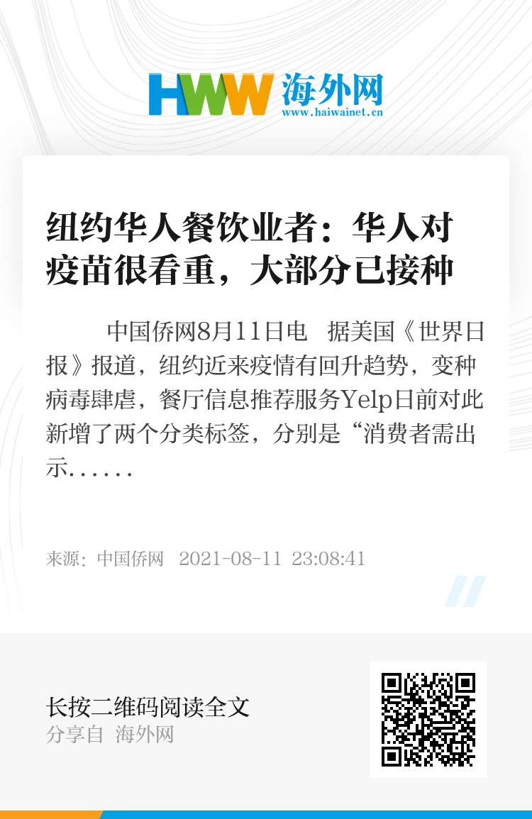 中国侨网8月11日电 据美国《世界日报》报道,纽约近来疫情有回升趋势,变种病毒肆虐,餐厅信息推荐服务Yelp日前对此新增了两个分类标签,分别是“消费者需出示疫苗接种证明”和“餐厅所有员工已打疫苗”,以此提供更多防疫咨询。华裔业者对此表示,华人对疫苗很看重,大部分已及时接种,此举虽可能影响部分生意,但能让人感到更安心。