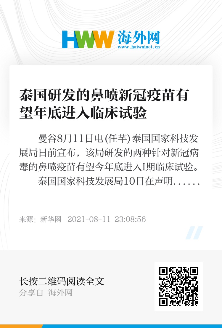新华社曼谷8月11日电(任芊)泰国国家科技发展局日前宣布,该局研发的两种针对新冠病毒的鼻喷疫苗有望今年底进入I期临床试验。