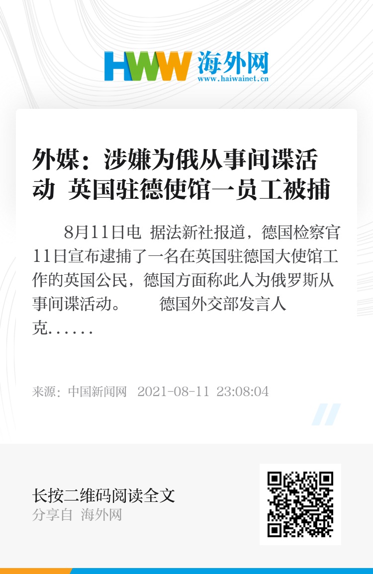 中新网8月11日电 据法新社报道,德国检察官11日宣布逮捕了一名在英国驻德国大使馆工作的英国公民,德国方面称此人为俄罗斯从事间谍活动。