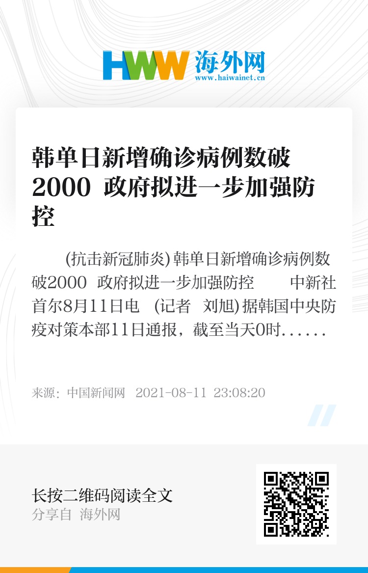 中新社首尔8月11日电 (记者 刘旭)据韩国中央防疫对策本部11日通报,截至当天0时,韩国较前一天0时新增新冠肺炎确诊病例2223例,累计确诊216206例。单日新增病例较前一天猛增686例,首次超过2000例,时隔两周刷新上月28日创下的最高纪录,并连续36天保持四位数,第四波大流行呈现继续蔓延态势。