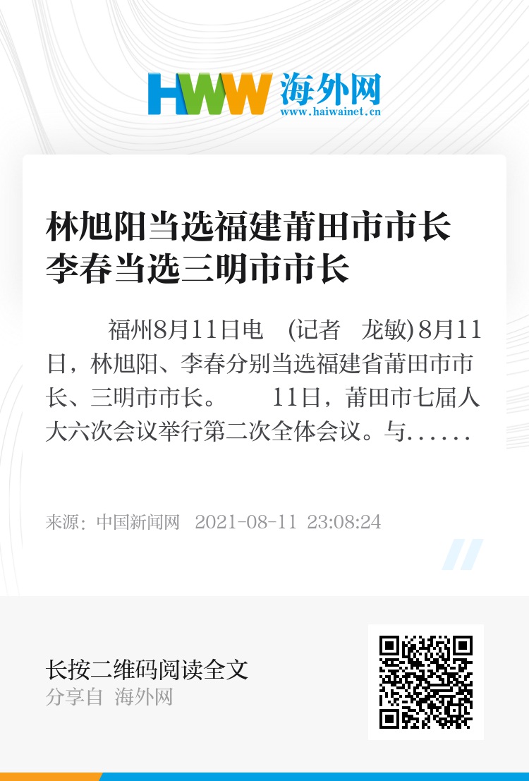中新网福州8月11日电 (记者 龙敏)8月11日,林旭阳、李春分别当选福建省莆田市市长、三明市市长。