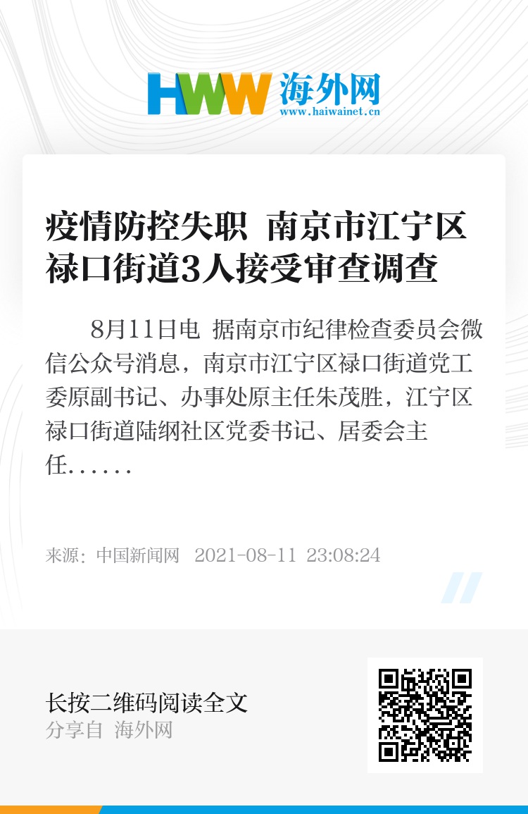 中新网8月11日电 据南京市纪律检查委员会微信公众号消息,南京市江宁区禄口街道党工委原副书记、办事处原主任朱茂胜,江宁区禄口街道陆纲社区党委书记、居委会主任邰晓俊,江宁区禄口街道陆纲社区居委会副主任周戎轩在落实社区疫情防控、人员排查工作中严重不负责任,不认真履行职责,涉嫌严重违纪违法,目前正接受江宁区纪委监委纪律审查和监察调查。