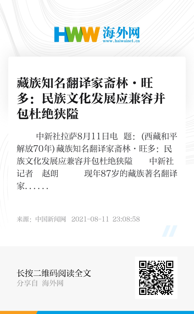 中新社拉萨8月11日电 题:(西藏和平解放70年)藏族知名翻译家斋林·旺多:民族文化发展应兼容并包杜绝狭隘