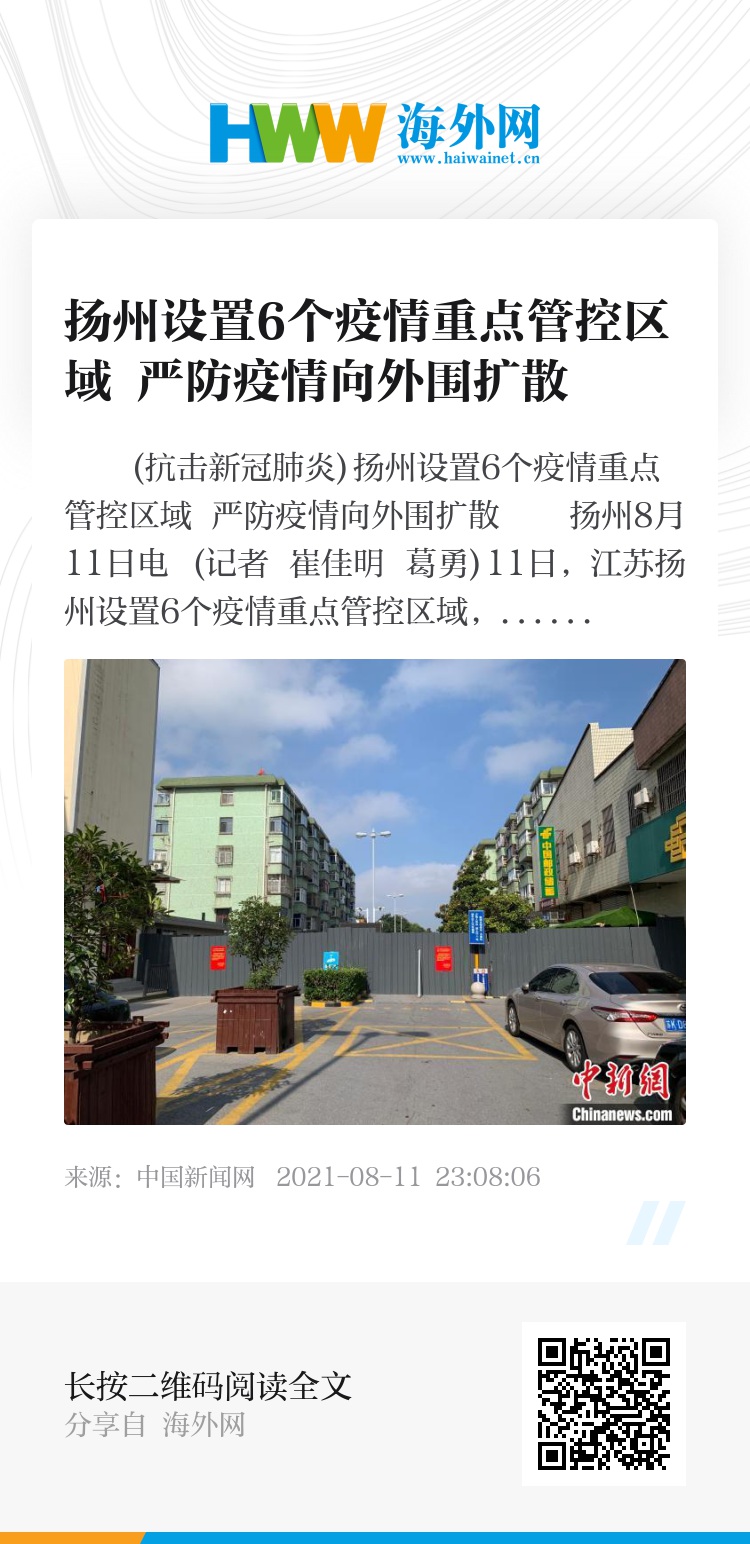 中新网扬州8月11日电 (记者 崔佳明 葛勇)11日,江苏扬州设置6个疫情重点管控区域,严防疫情向外围扩散,区域外无关人员一律不得进入。