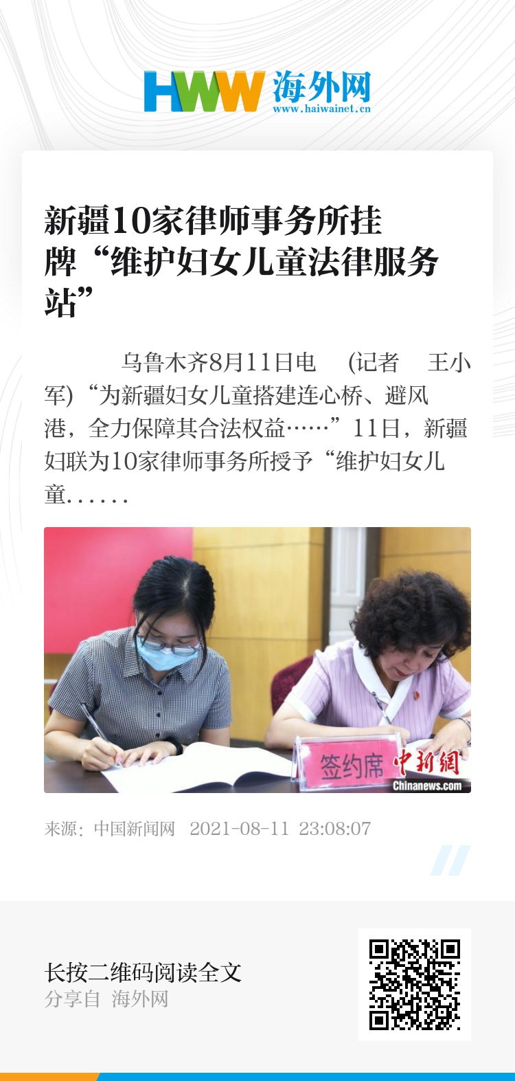 中新网乌鲁木齐8月11日电 (记者 王小军)“为新疆妇女儿童搭建连心桥、避风港,全力保障其合法权益……”11日,新疆妇联为10家律师事务所授予“维护妇女儿童法律服务站”牌子。
