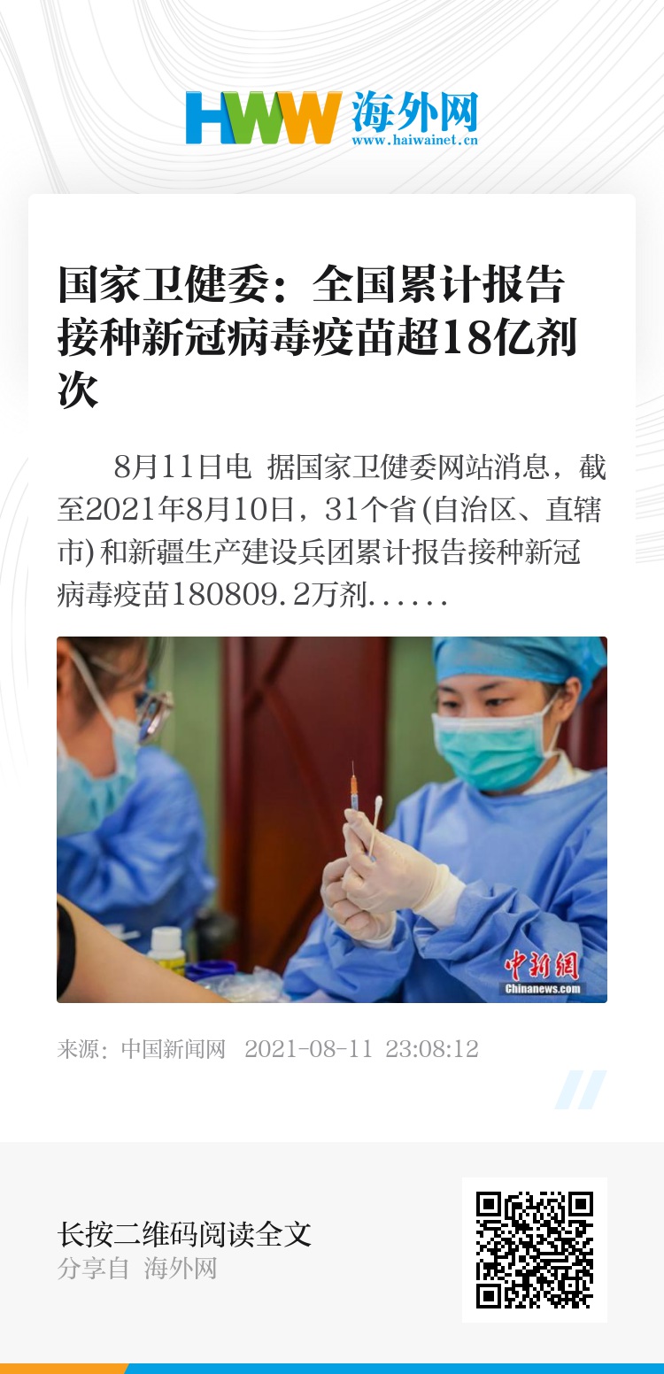 中新网8月11日电 据国家卫健委网站消息,截至2021年8月10日,31个省(自治区、直辖市)和新疆生产建设兵团累计报告接种新冠病毒疫苗180809.2万剂次。