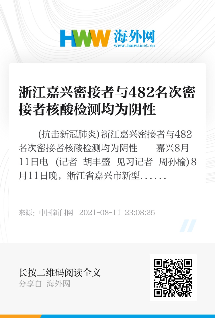(抗击新冠肺炎)浙江嘉兴密接者与482名次密接者核酸检测均为阴性