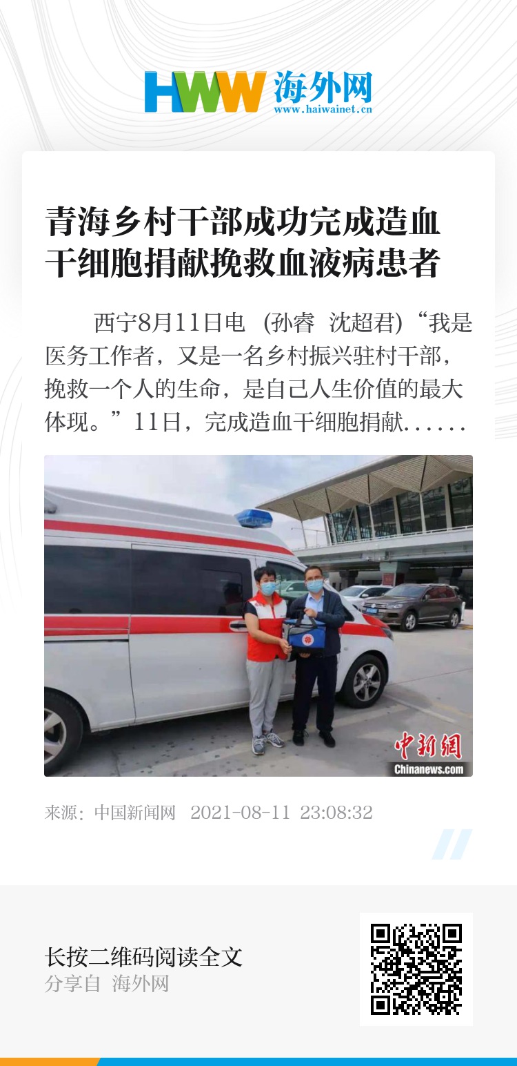 中新网西宁8月11日电 (孙睿 沈超君)“我是医务工作者,又是一名乡村振兴驻村干部,挽救一个人的生命,是自己人生价值的最大体现。”11日,完成造血干细胞捐献后,志愿者刘立真说。