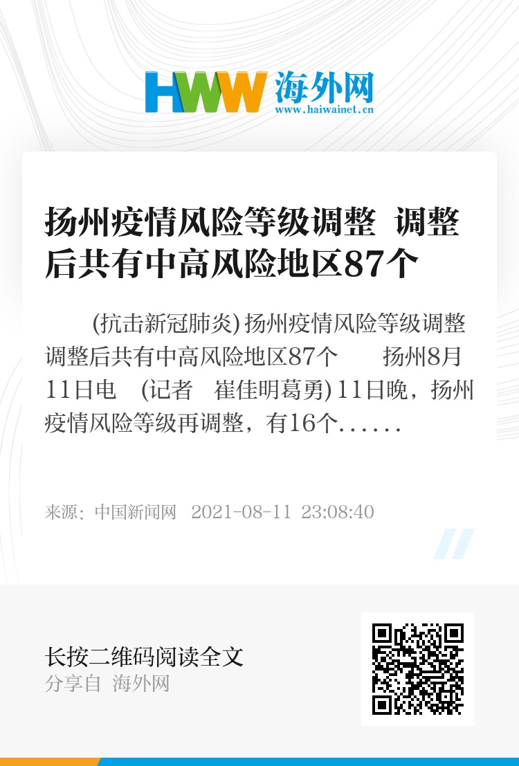 经扬州市新冠肺炎疫情防控工作指挥部研究,2021年8月11日起,对扬州市部分区域疫情风险等级进行调整: