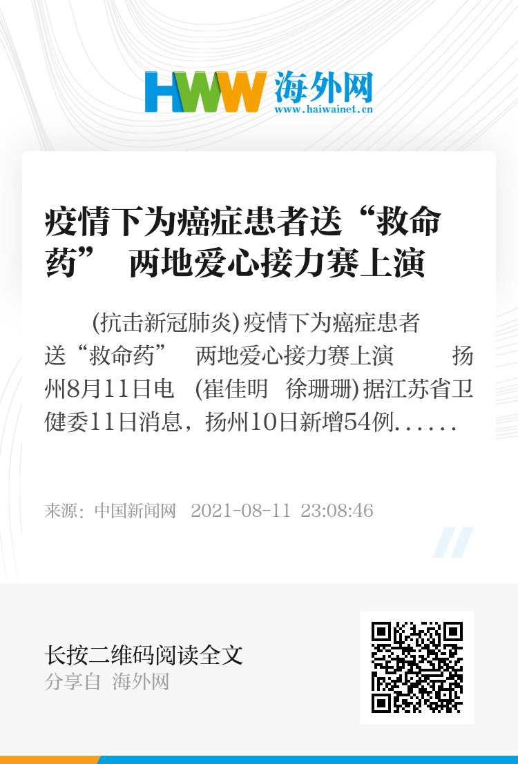 中新网扬州8月11日电 (崔佳明 徐珊珊)据江苏省卫健委11日消息,扬州10日新增54例本土新冠肺炎确诊病例。当前扬州新增本土确诊病例处于近期高峰,疫情形势仍然严峻之时,一场扬州、泰州两地交警无缝对接完成的爱心接力悄悄上演。