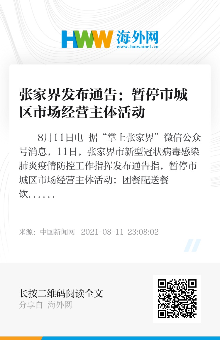 中新网8月11日电 据“掌上张家界”微信公众号消息,11日,张家界市新型冠状病毒感染肺炎疫情防控工作指挥发布通告指,暂停市城区市场经营主体活动;团餐配送餐饮企业只开展配餐服务,不对外开门营业。通告内容具体包括:
