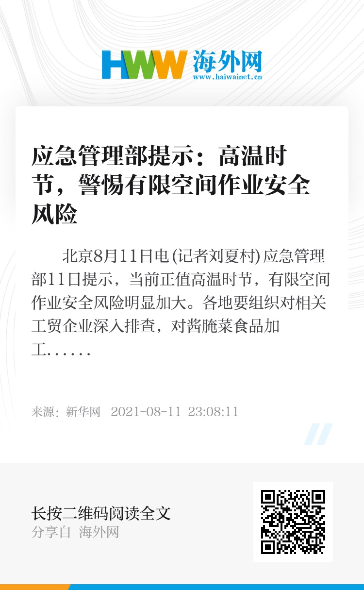 新华社北京8月11日电(记者刘夏村)应急管理部11日提示,当前正值高温时节,有限空间作业安全风险明显加大。各地要组织对相关工贸企业深入排查,对酱腌菜食品加工、造纸、皮革制造等重点企业开展指导服务和执法行动。