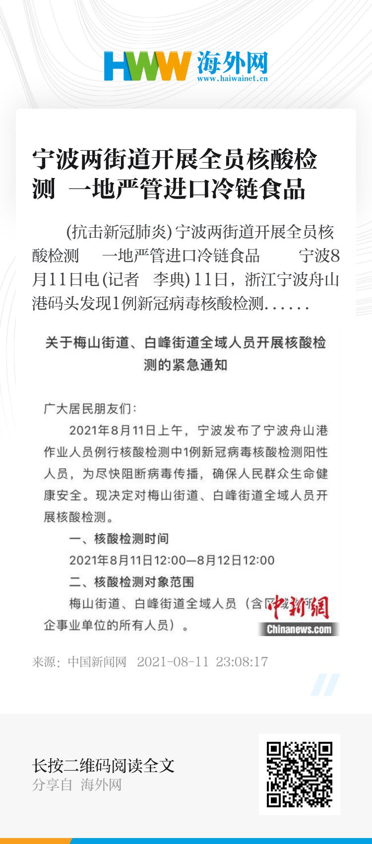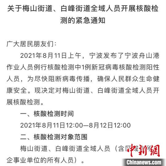 中新网宁波8月11日电(记者 李典)11日,浙江宁波舟山港码头发现1例新冠病毒核酸检测阳性人员。随即,宁波市北仑区新冠肺炎疫情防控领导小组办公室发布紧急通知,针对该区梅山街道、白峰街道全域人员开展核酸检测。