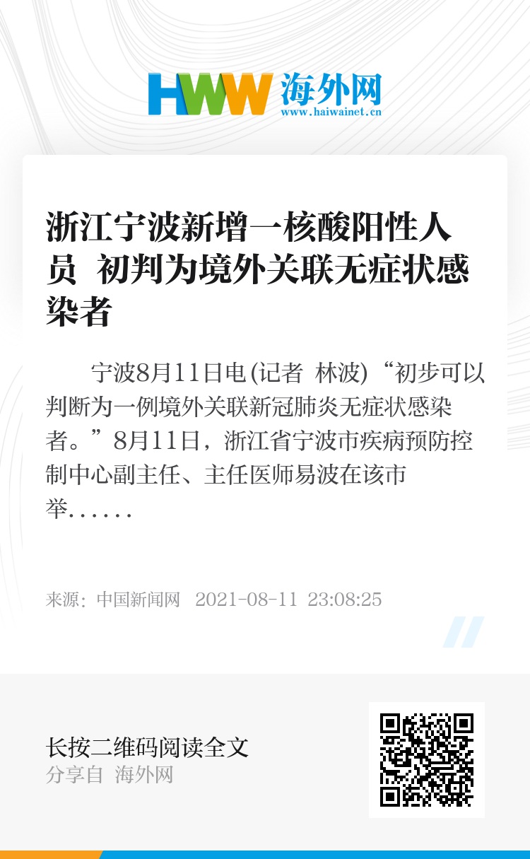 8月10日21时,宁波市北仑区在宁波舟山港作业人员例行检测中,发现1例新冠病毒核酸检测可疑阳性人员。