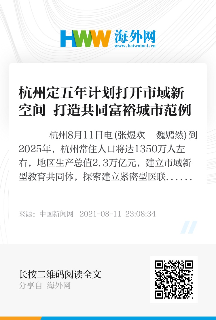 中新网杭州8月11日电(张煜欢 魏嫣然)到2025年,杭州常住人口将达1350万人左右,地区生产总值2.3万亿元,建立市域新型教育共同体,探索建立紧密型医联体,完善多元化住房保障体系,优化城市人口居住的空间格局,建成“产城融合、职住平衡、生态宜居、交通便利”的九大星城。