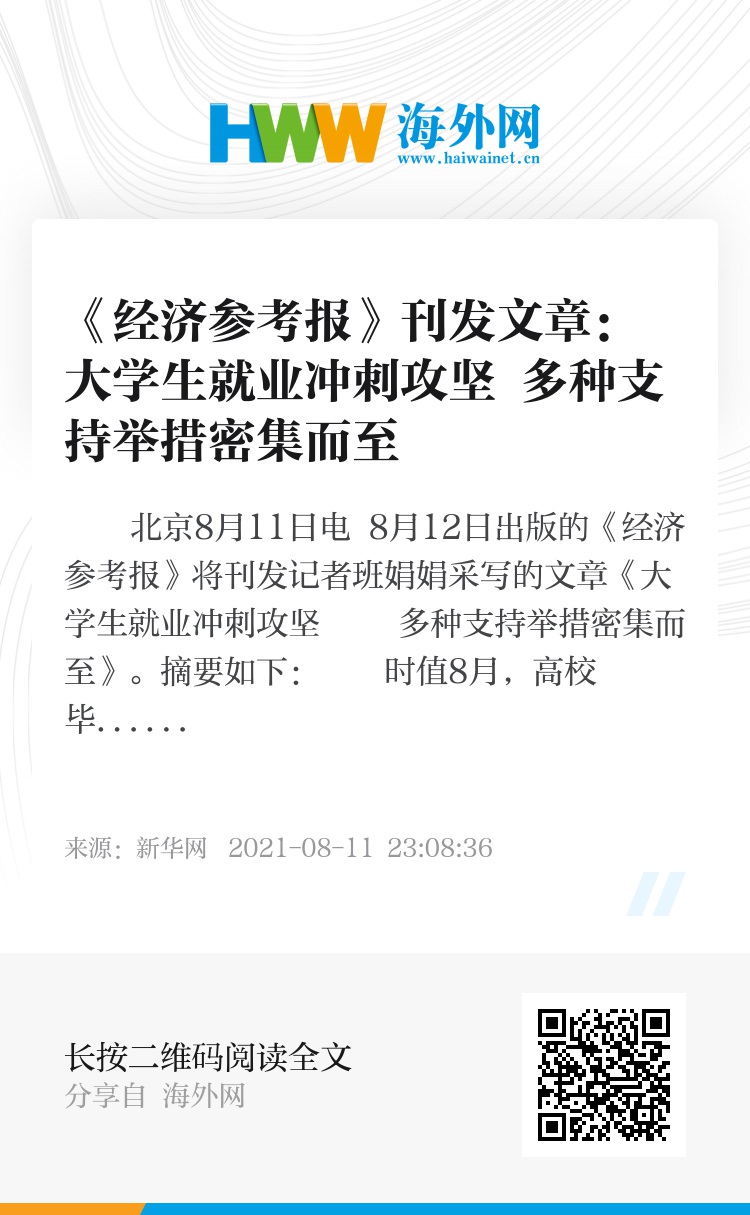 新华社北京8月11日电 8月12日出版的《经济参考报》将刊发记者班娟娟采写的文章《大学生就业冲刺攻坚 多种支持举措密集而至》。摘要如下: