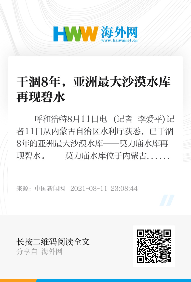中新网呼和浩特8月11日电 (记者 李爱平)记者11日从内蒙古自治区水利厅获悉,已干涸8年的亚洲最大沙漠水库——莫力庙水库再现碧水。