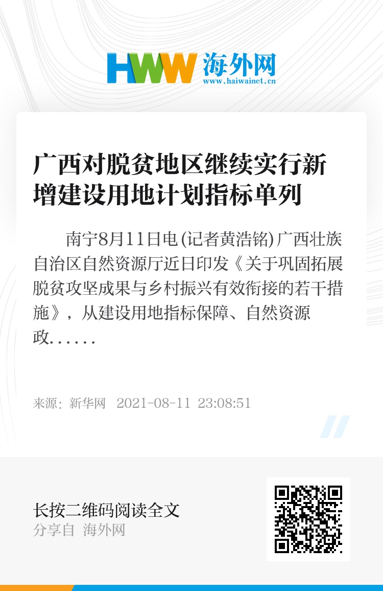 新华社南宁8月11日电(记者黄浩铭)广西壮族自治区自然资源厅近日印发《关于巩固拓展脱贫攻坚成果与乡村振兴有效衔接的若干措施》,从建设用地指标保障、自然资源政策倾斜等方面聚焦发力,明确过渡期内对脱贫地区继续实行新增建设用地计划指标单列,推进脱贫县和乡村振兴重点帮扶县巩固拓展脱贫攻坚成果,加快乡村振兴进程。