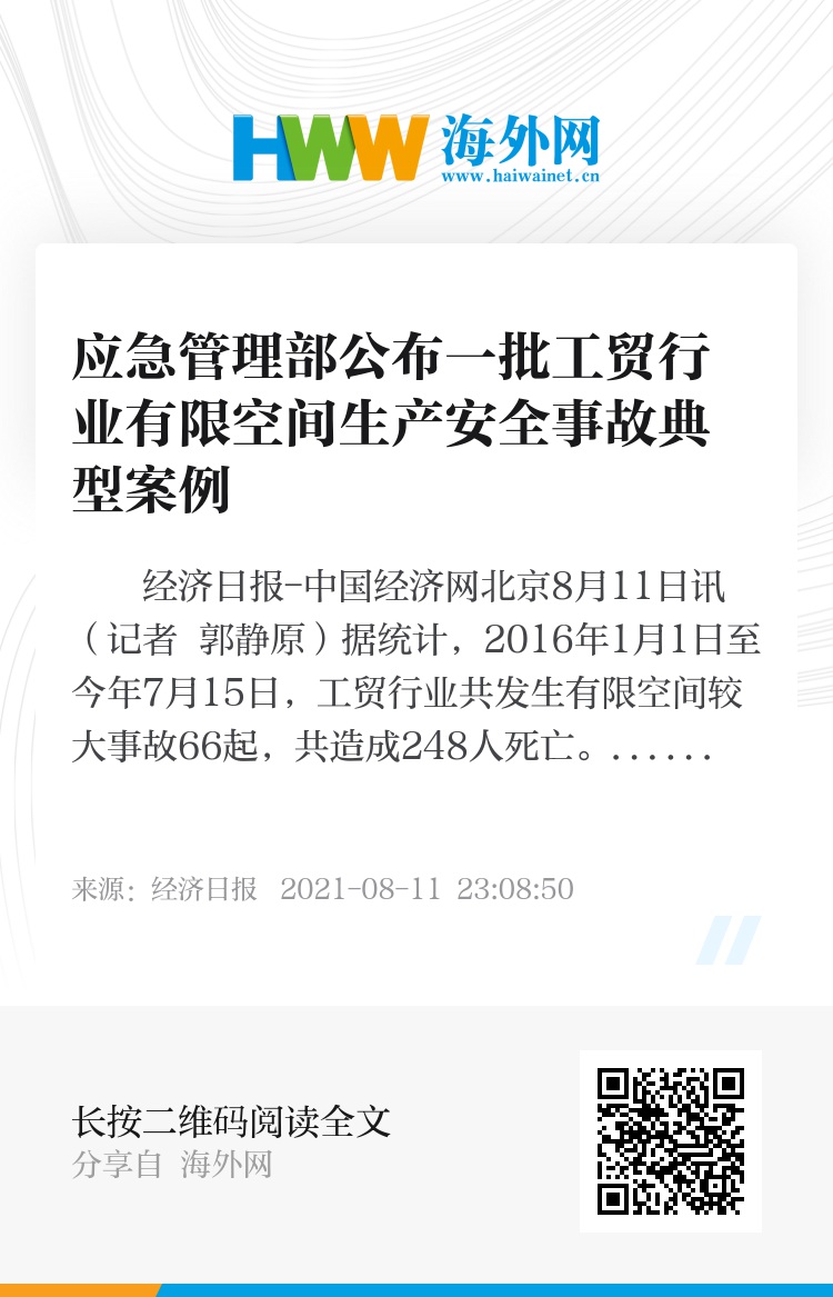 经济日报-中国经济网北京8月11日讯 (记者 郭静原)据统计,2016年1月1日至今年7月15日,工贸行业共发生有限空间较大事故66起,共造成248人死亡。其中,2017年、2018年间超过当年工贸行业较大事故起数的50%。今年以来,工贸行业已发生6起有限空间较大事故,共造成26人死亡,特别是四川省连续发生了两起死亡6人以上的有限空间中毒事故。这些事故暴露出一些企业对有限空间中毒亡人风险认识不清,不落实“先通风、再检测、后作业”的要求,安全培训不到位、防护装备不齐全等问题。