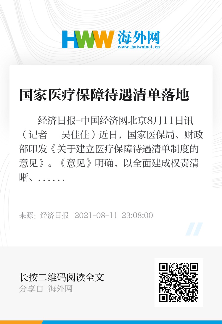 经济日报-中国经济网北京8月11日讯 (记者 吴佳佳)近日,国家医保局、财政部印发《关于建立医疗保障待遇清单制度的意见》。《意见》明确,以全面建成权责清晰、保障适度、可持续的多层次医疗保障体系为目标,适应建设中国特色医疗保障制度需要,确定基本保障内涵,厘清待遇支付边界,明确政策调整权限,规范决策制定流程,逐步建立健全医疗保障待遇清单制度。