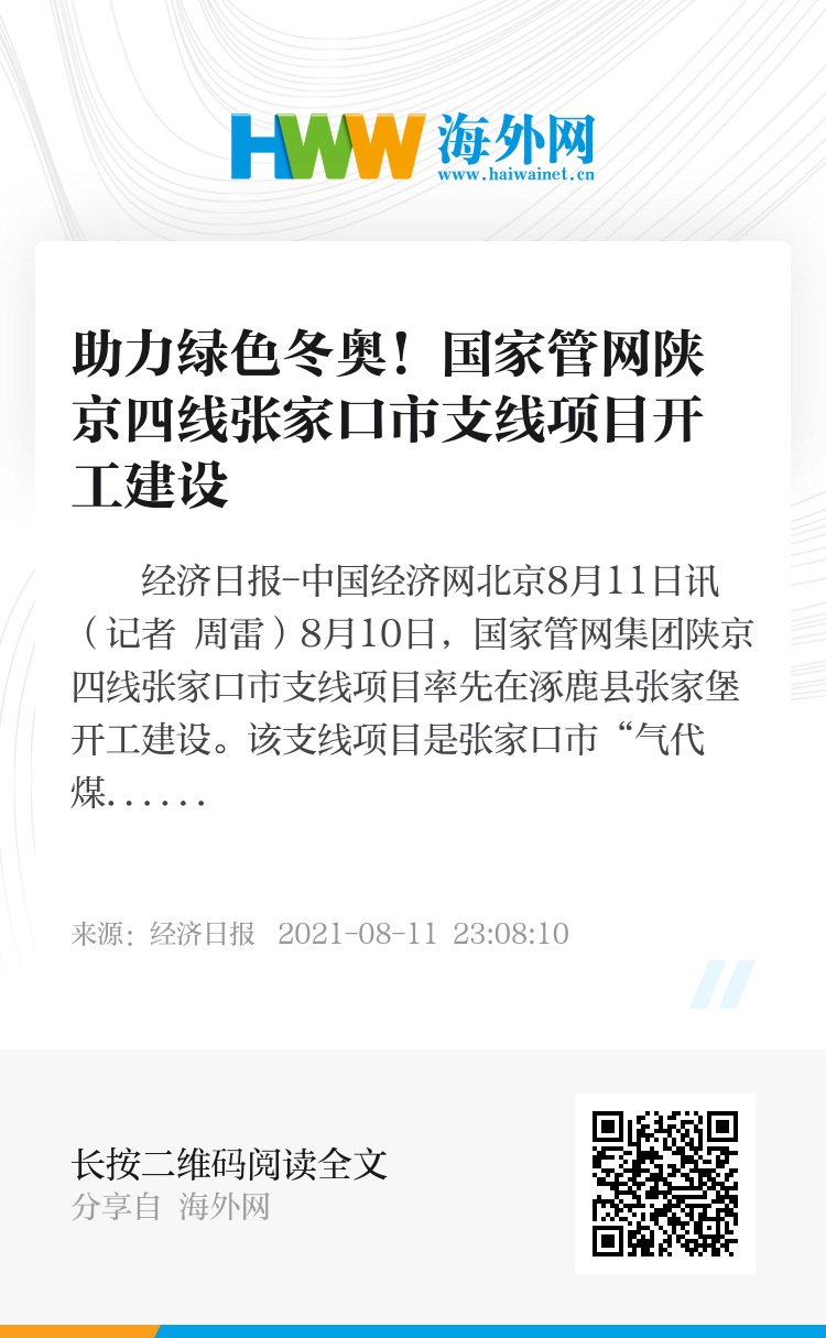 经济日报-中国经济网北京8月11日讯 (记者 周雷)8月10日,国家管网集团陕京四线张家口市支线项目率先在涿鹿县张家堡开工建设。该支线项目是张家口市“气代煤”工程建设的保障措施之一,对进一步提升张家口地区清洁用能水平、推进京津冀协同发展、践行“绿色办奥”理念具有重要意义。