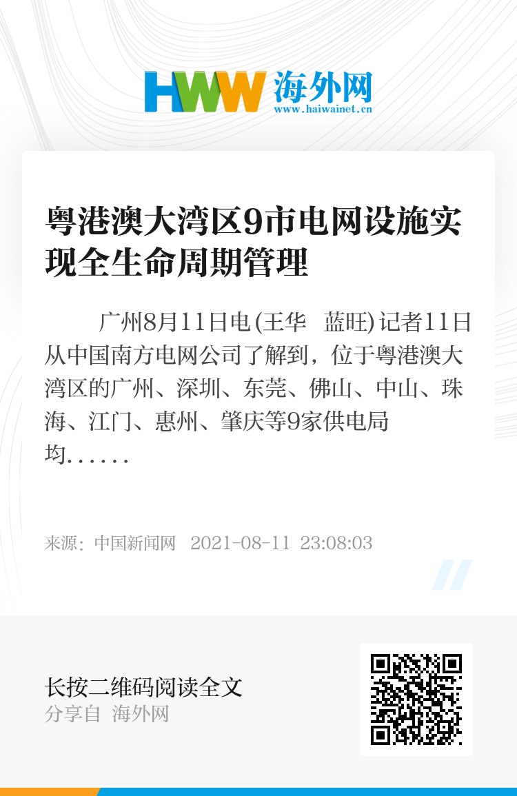 中新网广州8月11日电(王华 蓝旺)记者11日从中国南方电网公司了解到,位于粤港澳大湾区的广州、深圳、东莞、佛山、中山、珠海、江门、惠州、肇庆等9家供电局均已通过国际资产管理体系ISO55000体系证书,南方电网公司在行业内率先推行该体系认证,已有13家公司获得该认证。