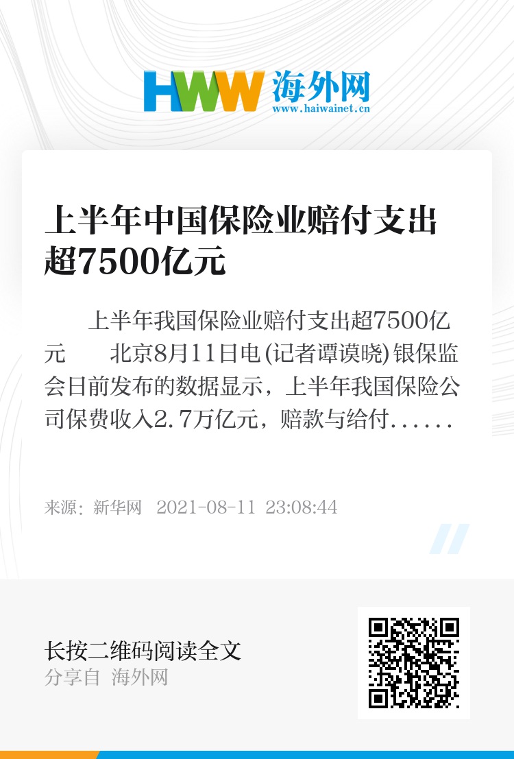 新华社北京8月11日电(记者谭谟晓)银保监会日前发布的数据显示,上半年我国保险公司保费收入2.7万亿元,赔款与给付支出7531亿元。