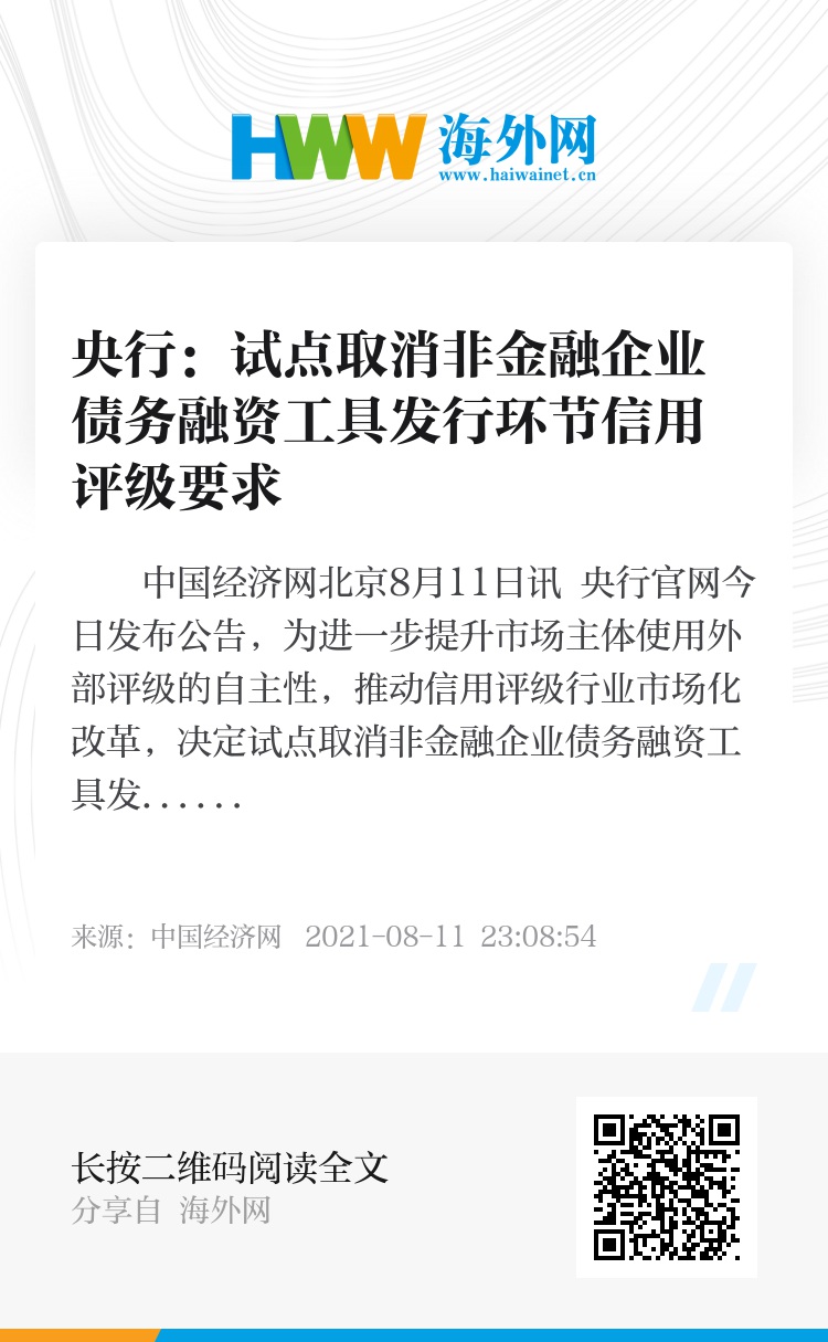 中国经济网北京8月11日讯 央行官网今日发布公告,为进一步提升市场主体使用外部评级的自主性,推动信用评级行业市场化改革,决定试点取消非金融企业债务融资工具发行环节信用评级的要求。以下为原文: