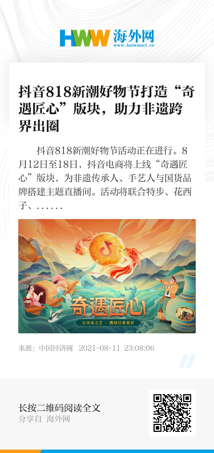 抖音818新潮好物节活动正在进行。8月12日至18日,抖音电商将上线“奇遇匠心”版块,为非遗传承人、手艺人与国货品牌搭建主题直播间。活动将联合特步、花西子、适道文化等不同领域的品牌,推出十余场非遗跨界直播,推介非遗技艺国潮好货和匠心好物,助力非遗更好地走进日常生活。
