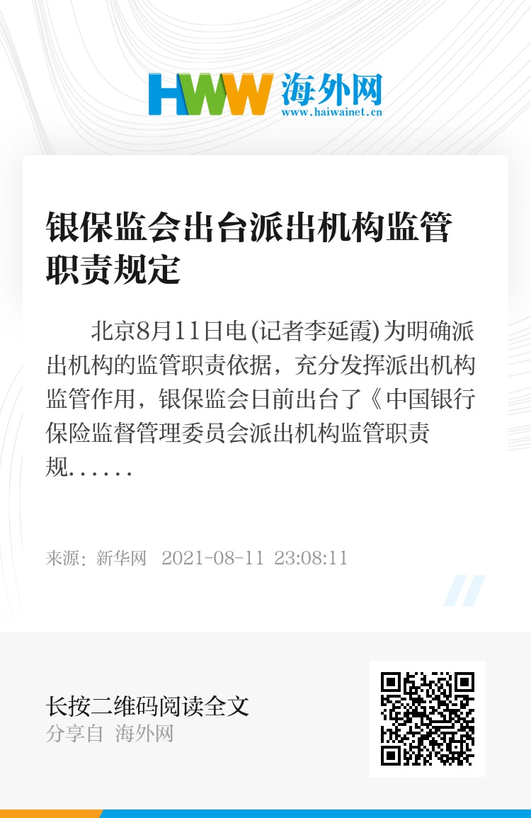 新华社北京8月11日电(记者李延霞)为明确派出机构的监管职责依据,充分发挥派出机构监管作用,银保监会日前出台了《中国银行保险监督管理委员会派出机构监管职责规定》。
