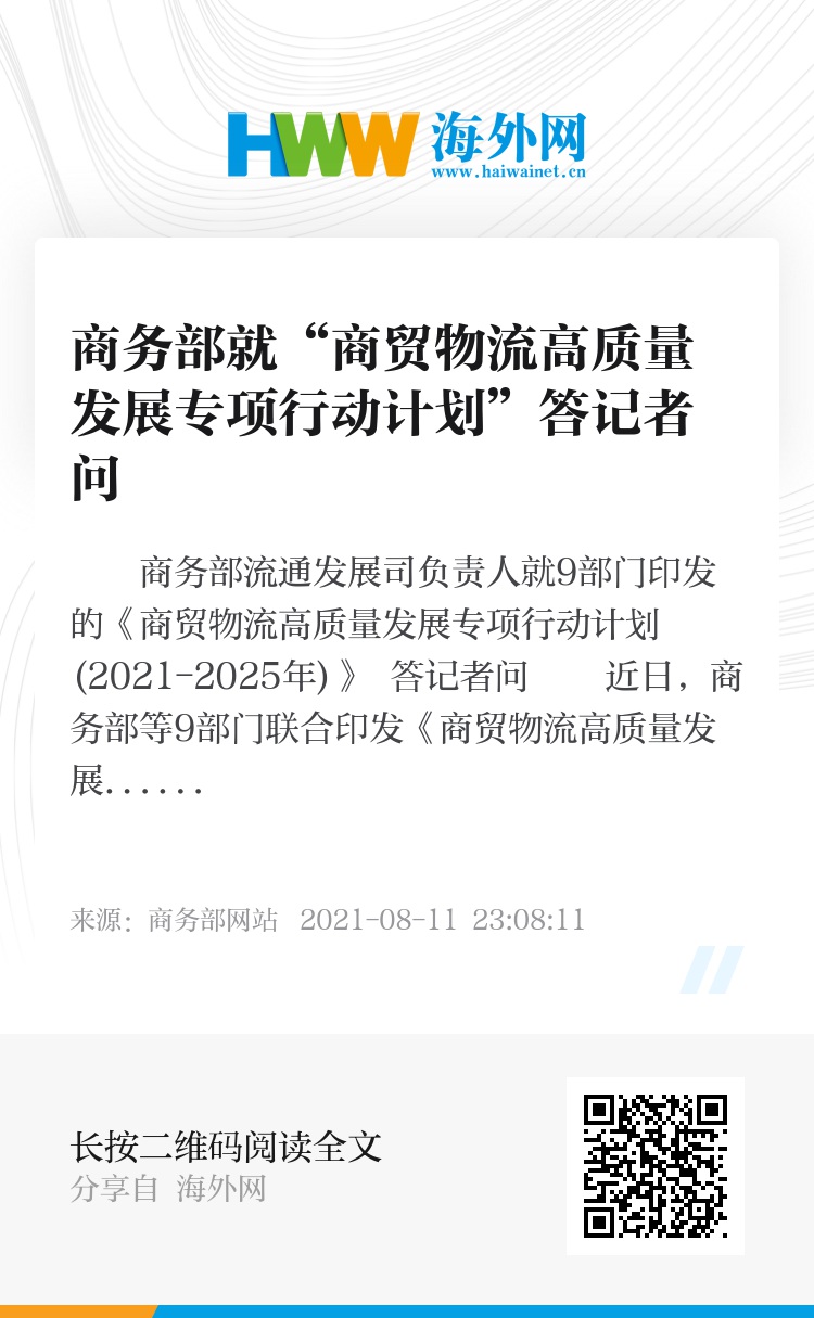 商务部流通发展司负责人就9部门印发的《商贸物流高质量发展专项行动计划(2021-2025年)》 答记者问