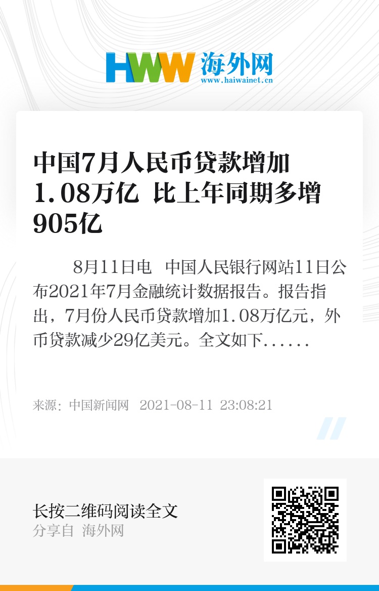 中新网8月11日电 中国人民银行网站11日公布2021年7月金融统计数据报告。报告指出,7月份人民币贷款增加1.08万亿元,外币贷款减少29亿美元。全文如下:
