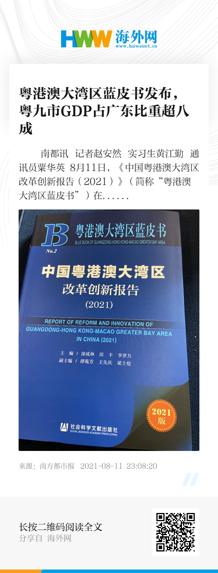 南都讯 记者赵安然 实习生黄江勤 通讯员粟华英 8月11日,《中国粤港澳大湾区改革创新报告(2021)》(简称“粤港澳大湾区蓝皮书”)在广州发布。该书由广州市粤港澳大湾区(南沙)改革创新研究院、广州大学广州发展研究院、广东省区域发展蓝皮书研究会共同编著,以粤港澳大湾区为宏观视角,聚焦粤港澳大湾区建设和发展的宏观形势分析和研究,总结并概括了粤港澳大湾区在2020年的发展状况,预测并分析了2021年大湾区发展所将面临的机遇和挑战,并提出了具有针对性和建设性的对策建议。