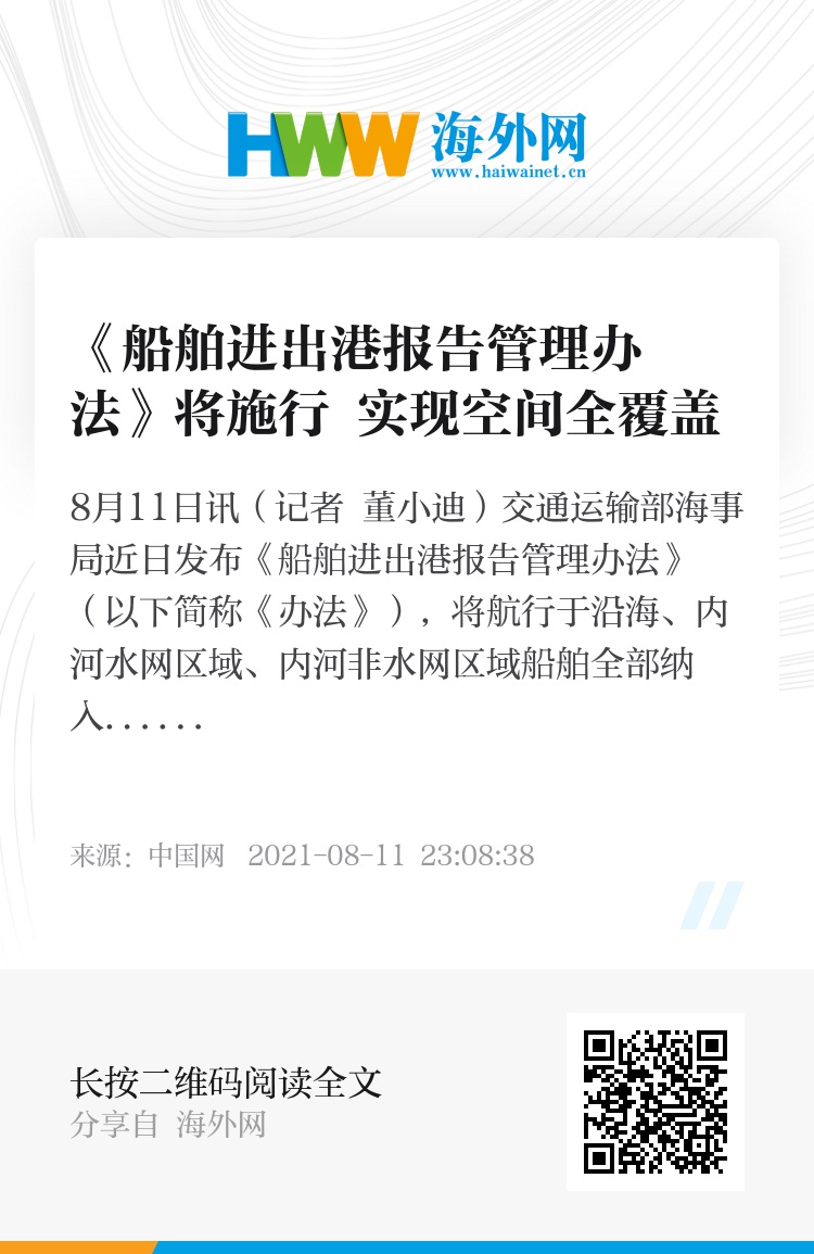 中国网8月11日讯(记者 董小迪)交通运输部海事局近日发布《船舶进出港报告管理办法》(以下简称《办法》),将航行于沿海、内河水网区域、内河非水网区域船舶全部纳入,实现了船舶进出港报告管理在空间上的全覆盖,《办法》将于9月1日起施行。