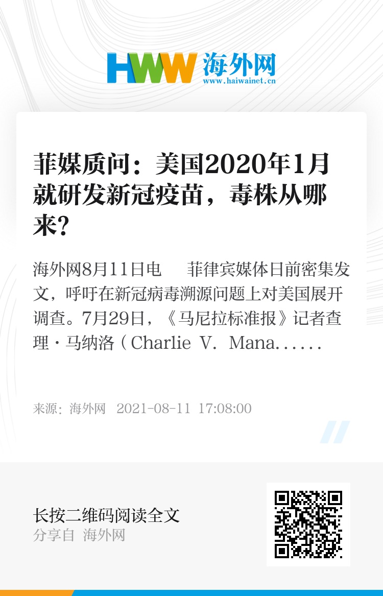海外网8月11日电 菲律宾媒体日前密集发文,呼吁在新冠病毒溯源问题上对美国展开调查。7月29日,《马尼拉标准报》记者查理·马纳洛(Charlie V. Manalo)在该报新闻网站上以《它们(美国)开始了这个笑话》为题刊文指出,美国新冠肺炎疫情暴发的时间点,以及美国进行新冠溯源调查的真实原因都十分蹊跷。