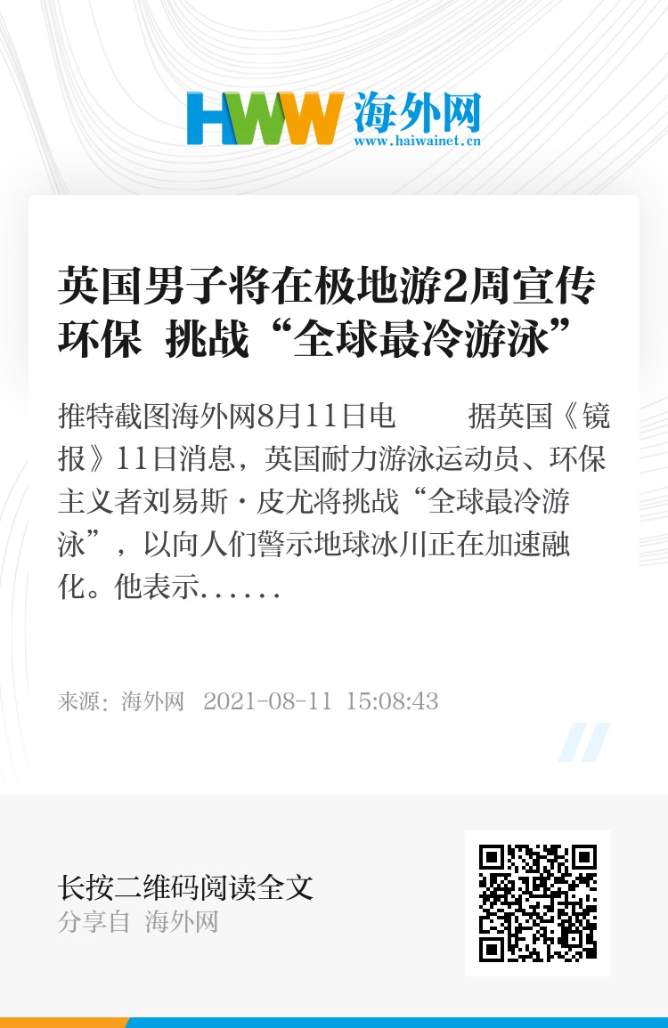 皮尤表示:“北极的遭遇将影响我们的星球以及生活在上面的一切的未来。如果全球温度继续升高,极地冰盖将融化,海平面上升。除非我们采取紧急行动,通过大幅减排来遏制全球气温上升,否则岛屿和沿海城市将被淹没。”据媒体此前报道,皮尤以擅长冰冷水中游泳而著称,他还曾创下沿泰晤士河游泳距离最长纪录,比此前的最高纪录多140多公里。(海外网 王珊宁)