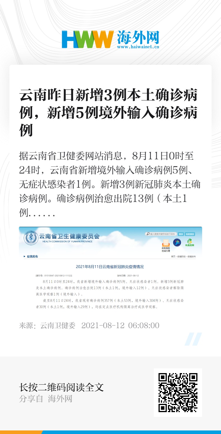 据云南省卫健委网站消息,8月11日0时至24时,云南省新增境外输入确诊病例5例、无症状感染者1例。新增3例新冠肺炎本土确诊病例。确诊病例治愈出院13例(本土1例,境外输入12例)、无症状感染者解除隔离医学观察1例(境外输入)。