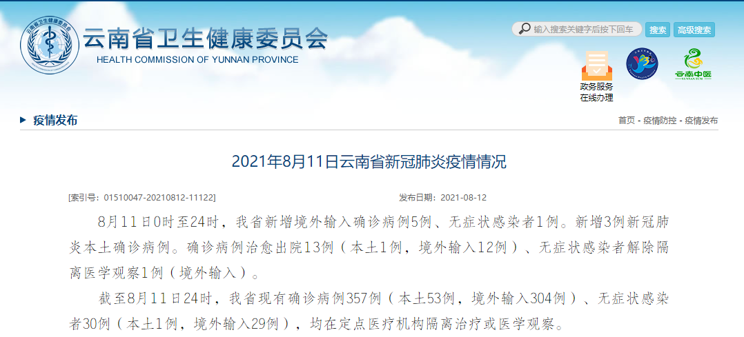 截至8月11日24时,云南省现有确诊病例357例(本土53例,境外输入304例)、无症状感染者30例(本土1例,境外输入29例),均在定点医疗机构隔离治疗或医学观察。