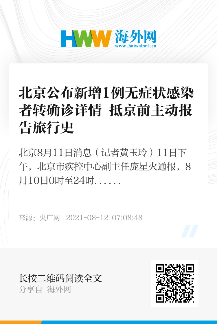 确诊病例住址为房山区阎村镇天恒乐活城北区,为8月1日公布的无症状感染者。近日出现发热等症状,综合流行病史、临床表现、实验室检测和影像学检查等结果,8月10日诊断为确诊病例,临床分型为轻型。