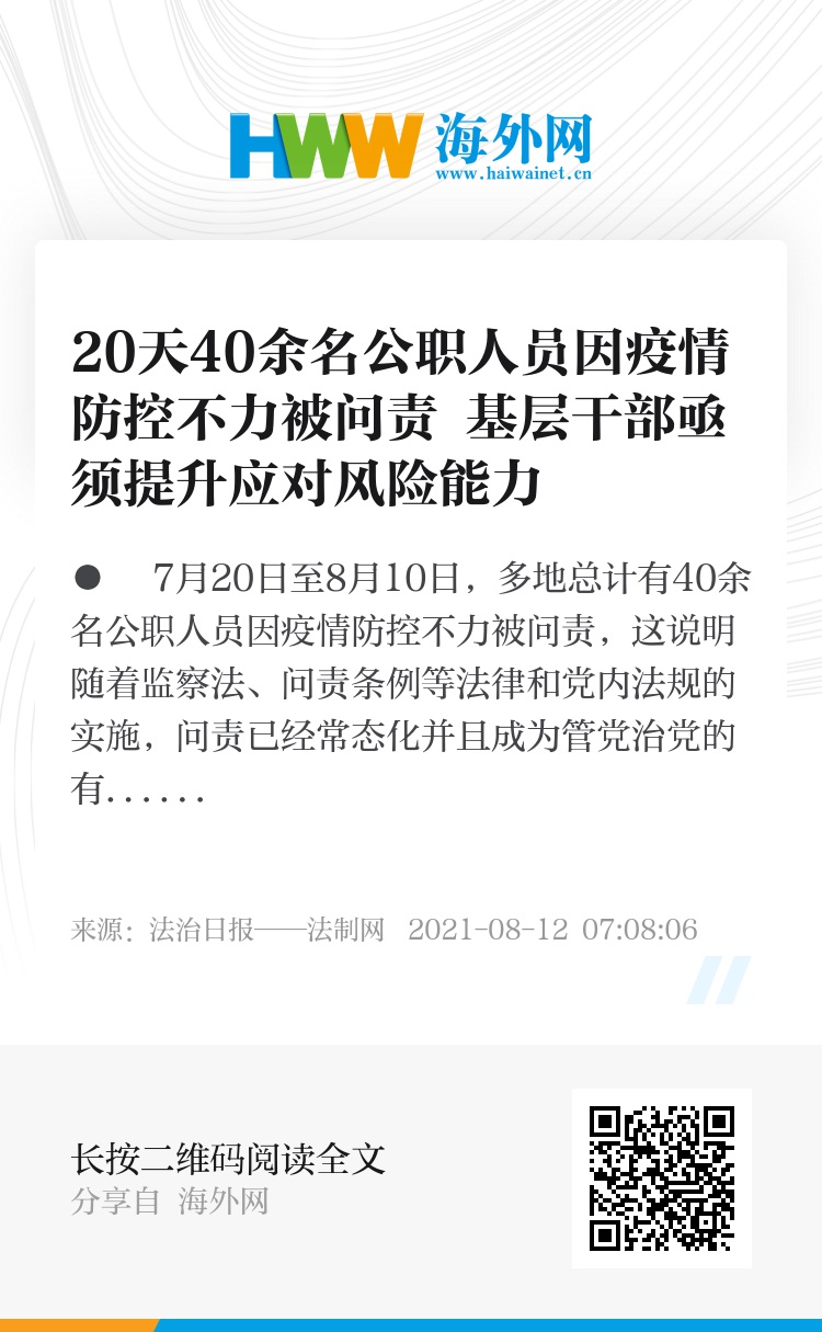 ● 7月20日至8月10日,多地总计有40余名公职人员因疫情防控不力被问责,这说明随着监察法、问责条例等法律和党内法规的实施,问责已经常态化并且成为管党治党的有力保障