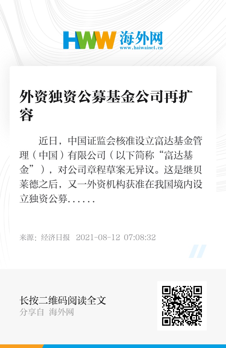 近日,中国证监会核准设立富达基金管理(中国)有限公司(以下简称“富达基金”),对公司章程草案无异议。这是继贝莱德之后,又一外资机构获准在我国境内设立独资公募基金管理公司。